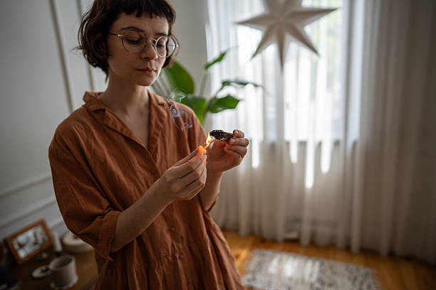Relaxed woman lighting palo santo stick, filling home with aromatic smoke through personal ritual. Creating cozy space, mindfulness practice, mental clarity, self care routine, spiritual connection