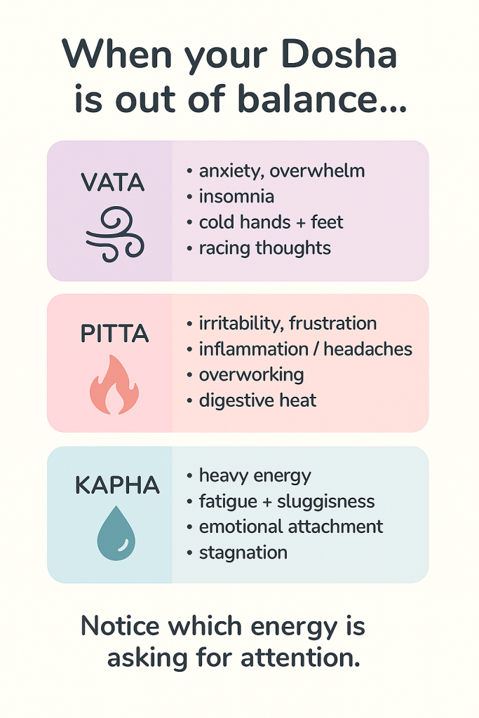 - When imbalanced: Anxiety, overwhelm, insomnia, joint pain, constipation, irregular routines.